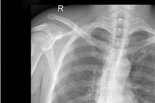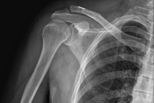 一名50岁的男性患者,因不慎摔伤致右肩关节肿痛,并伴活动受限4天后来附院求治。入院查体发现患者右肩部肿胀明显,右锁骨远端隆起畸形,局部明显按压出现疼痛,肩部外展活动受限,进行X线检查显示“右肩锁关节脱位”。骨三科医师团队根据患者病情,进行充分商讨,确定了手术治疗方案,决定为患者实施“右肩锁关脱位复位带袢钢板内固定术”。由副主任医师蒋宇平主刀,骨三科手术团队在患者锁骨上方及喙突处各取2cm手术切口,将肩锁关节复位后,使用瞄准器由喙突基底部向锁骨远端建立骨性隧道,最后将带袢钢板由骨道穿出后固定,术中出血仅10ml左右。