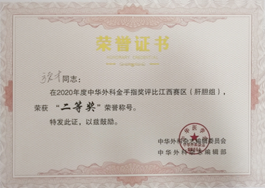 近日,第五届全国普通外科中青年医师手术展演暨中华外科金手指奖评比江西赛区在南昌举行。由永利yl23411集团官网附属医院肝胆外科主任方宏才主刀,主治医生余涛、夏广丰协助完成的《3D腹腔镜胰十二指肠切除术》手术视频,以其精湛规范化的技术水准荣获此次大赛二等奖。