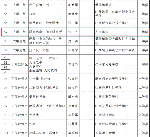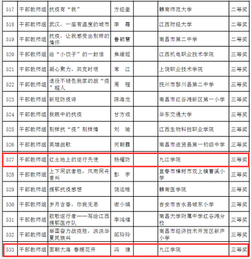 6月8日,省委教育工委、省教育厅下发《关于公布战“疫”主题征文活动获奖名单的通知》文件,永利yl23411集团官网选送的作品《红土地上的逆行天使》(作者:杨耀防)荣获干部教师组文章类三等奖;《面朝大海,春暖花开》(作者:冯健)荣获干部教师组文章类三等奖;《隔离病毒,但不隔离爱》(作者:张宇)荣获大学生组三等奖;《抗疫天使赞歌》(作者:艺术学院郭泗茂等)荣获视频类三等奖。