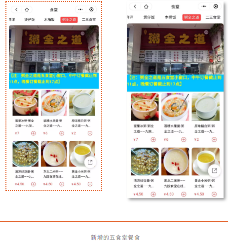 本学期,送餐服务仍在不断更新中,选择范围从上学期的二、三食堂扩展到四食堂、五食堂,增加了煲仔饭和木桶饭等选择,单餐可接300单以上。
