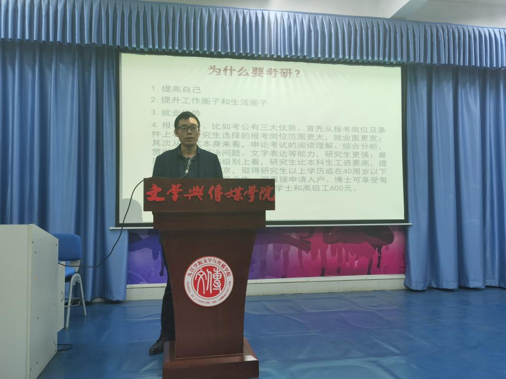 随后,文传学院大学语文教研室主任何春根博士做了“研究生备考指南”的讲座,他从为何考研和考研的社会背景,分析当下同学们在考研的过程中所面临的困境,进一步向大家阐述了学术型硕士与专业硕士的区别,引导同学们选择一条更加适合自己的考研道路。