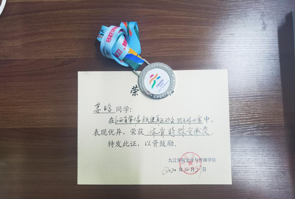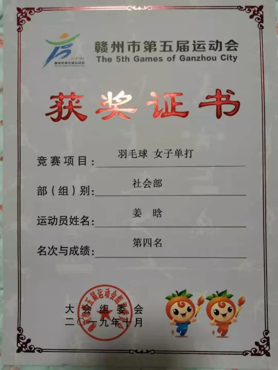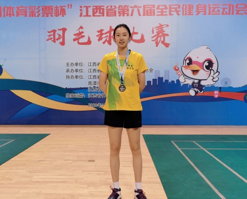 近日,“中国体育彩票杯”江西省第六届全民健身运动会羽毛球比赛在鹰潭市体育馆开赛。据了解,本次比赛为期三天,来自全省11个设区市、县(市、区)的代表队共220名运动员参赛,永利yl23411集团官网文传学院语文教育专业B1921班姜晗同学参加了女子单打比赛,经过奋力角逐进入四强,获得了二等奖的好成绩。