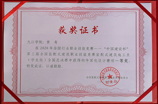 经过两天激烈的角逐,建工学生师生荣获了一等奖两项、优秀指导教师奖2项。其中,袁璐、曾莉莉获“装配式建筑构件制作与安装”赛项一等奖(全国排名第8,江西省排名第1,江西省唯一一等奖,);黄奇获“装配式建筑深化设计”赛项一等奖(全国排名第14,江西排名第2,江西省两个一等奖);沈辉、李华锋获优秀指导教师奖两项。