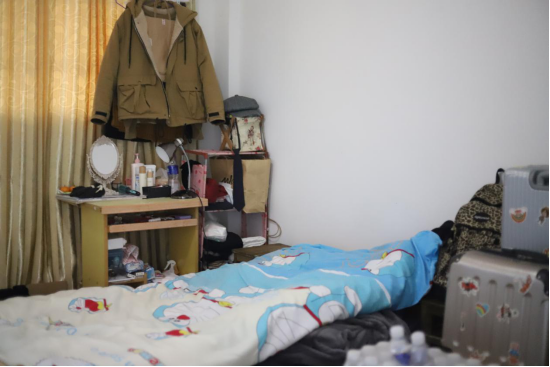 吃过饭后,我们去了三位支教老师的宿舍。这是一个二十平米左右的小房间,房间里摆了三张床,床头柜上摆放的绿植和护肤品提醒了我们,这三位支教老师是爱美的女孩子,在繁忙的教学任务之余,她们也爱养花种草给生活增加绿色。女孩子们寝室收拾得很整齐,各种物品摆放有序,在这个不大的宿舍里,她们常常与母校、与父母在梦里相见。
