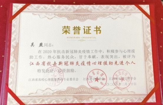 12月28-30日,在江西师范大学举办的“同心抗疫,共建平安江西——疫情防控常态化背景下心理学人的责任与使命”2020学术年会上,永利yl23411集团官网教育学院党委副书记吴燕因在抗疫心理援助工作中的突出贡献,荣获了“江西省抗击新冠肺炎疫情心理援助先进个人”称号。