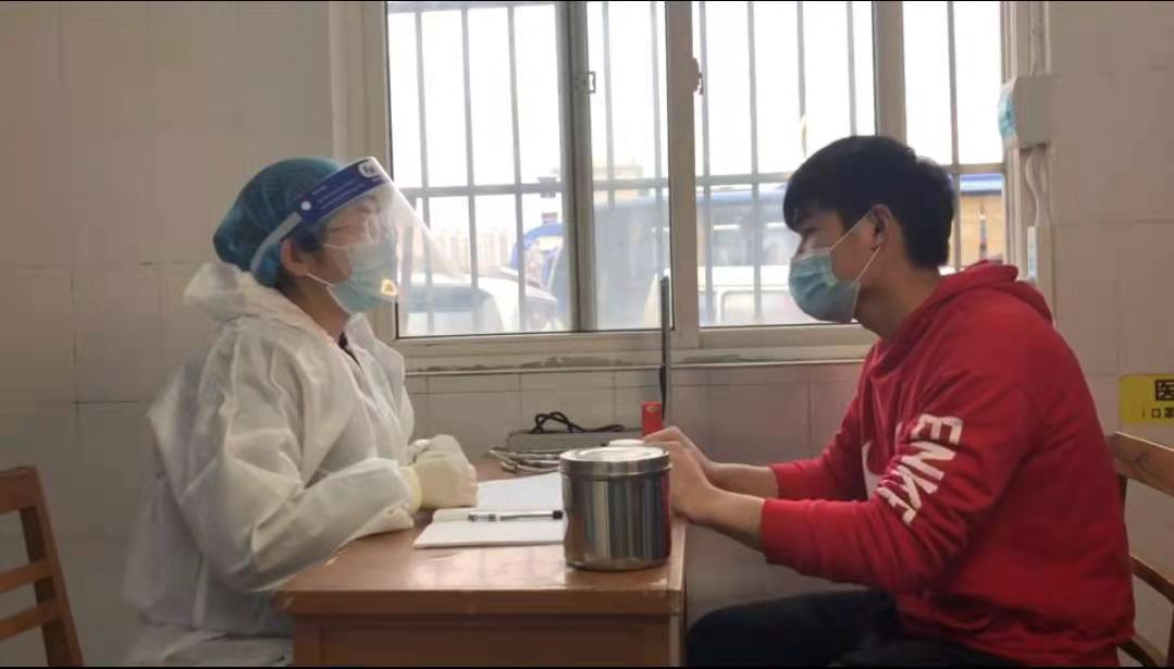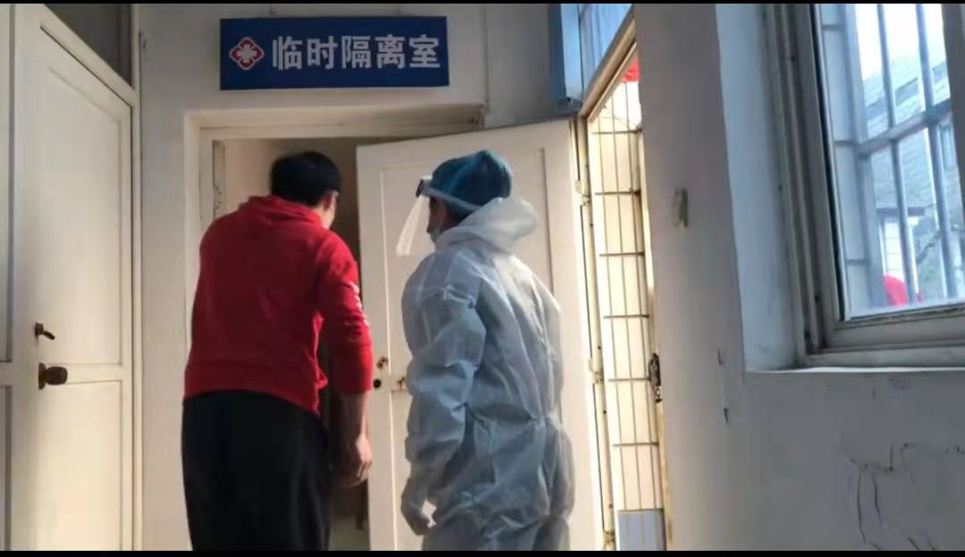 校医院内,学生被安排到指定临时隔离室内。医务人员询问学生基本信息及旅居史等基本情况。