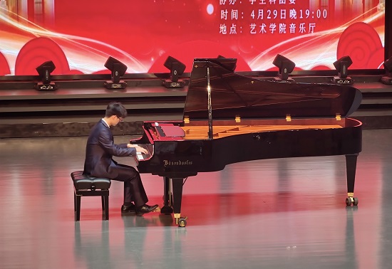 音乐会在钢琴曲《山丹丹开花红艳艳》的演奏中拉开了帷幕,此曲将中国特有的红色美学元素与西方钢琴演奏技法完美地融合,诉说了中央红军到达陕北的革命历史史实,展现了陕北地区人民的爱国情怀和在中国共产党领导下的美好生活画面。