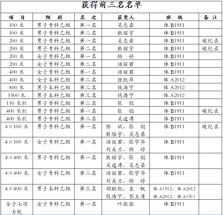 本次比赛由永利yl23411集团官网体育学院党委副书记冯亚兵领队,陈剑兴、刘利江、曹钧三位老师任教练带队参赛。永利yl23411集团官网派出的24名运动员分别参加了男、女本科甲组,男、女本科乙组以及男、女专科乙组的27个项目的比赛,斩获了9金8银2铜,并有38人次获得前八名,打破男子专科乙组200米(永利yl23411集团官网两名运动员均打破记录并获得冠亚军)、400米栏、4×100米省大学生田径运动会赛会纪录。永利yl23411集团官网还在没有专科甲组运动员参加的情况下,获得专科组男子团体第一名、女子团体第四名和男、女团体第二名的好成绩。