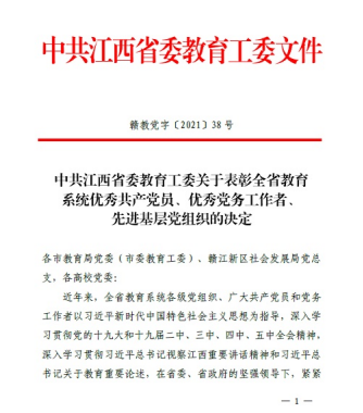 面对荣誉,杨涛同志表示:“很荣幸在中国共产党100年华诞被评为江西省教育系统优秀共产党员,这既是对一名普通教育工作者的肯定,更是对本人今后工作的鞭策与激励。我将以此为新起点,从百年党史中汲取力量,认真落实立德树人根本任务,为学校的建设与发展做出新的更大贡献。”