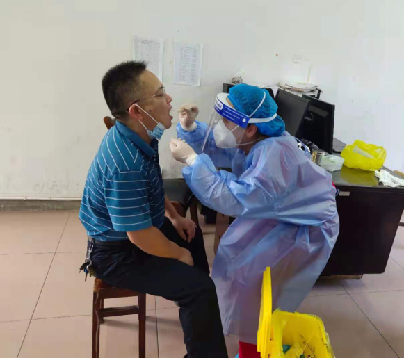 采样现场,医务人员头戴防护面罩、身着隔离衣,不畏酷热,克服种种困难,忙碌而有序地对采样对象进行咽拭子采样。