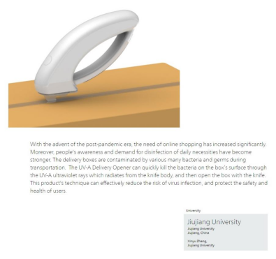 本次作品“UV-A Delivery Opener”是一款能对快递箱表面进行快速消毒的拆箱刀具。后疫情时代,网络购物已成主流消费模式,但流转的快递箱给病毒的传播带来隐患。为了减少接触者病毒感染的风险,该设计作品将UV-A消毒技术与快递拆箱刀进行了结合与创新,旨在满足人们对物件消毒的需求,保护接触者的安全与健康。