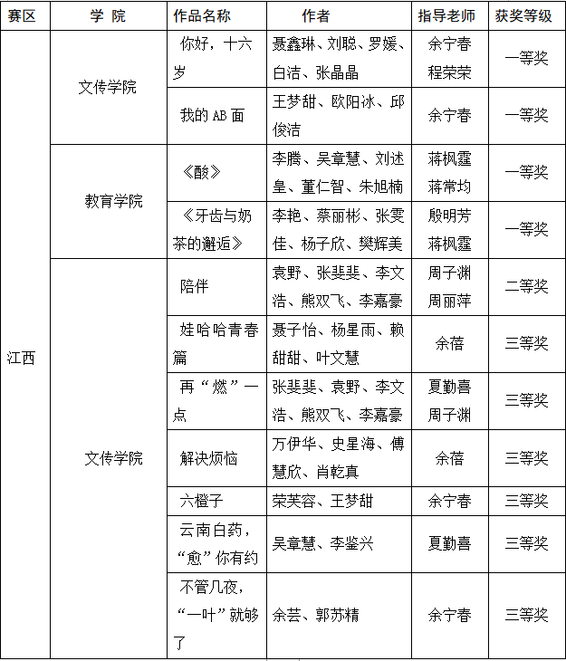 本届大广赛共设置了10个命题单元,分平面、影视、微电影、广播、策划案等10个作品类别,由省和全国两个赛区递级评审。在9月3日公布的第13届大广赛江西赛区获奖名单中,永利yl23411集团官网师生获得一等奖4项,二等奖1项,三等奖7项。在全国总决赛中,由永利yl23411集团官网文传学院夏勤喜、周子渊老师指导,张斐斐、袁野、李文浩、熊双飞、李嘉豪等同学创作的影视广告作品《再“燃”一点》获得二等奖;由教育学院蒋枫霆、蒋常均老师指导,李腾、吴章慧、刘述皇、董仁智、朱旭楠等同学创作的微电影广告作品《酸》获得三等奖;由文传学院周子渊、周丽萍老师指导,袁野、张斐斐、李文浩、熊双飞、李嘉豪等同学创作的微电影广告作品《陪伴》获得优秀奖;由文传学院夏勤喜老师指导,吴章慧、李鉴兴等同学创作的广告策划案作品《云南白药,“愈”你有约》获得优秀奖。这一赛事结果在获奖作品类别、数量和等级上都超过以往各届。
