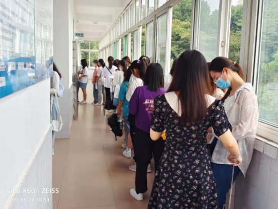 图为志愿者有序引导学生参与体检项目