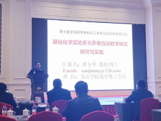 刘有智教授、夏淑倩教授、钟秦教授等化工领域知名专家分别为大会做了精彩的报告。永利yl23411集团官网曹小华教授应邀做了题为“基础化学实验多元多维互动教学模式的研究与实践”的邀请报告。该报告简要介绍了学校办学特色优势,详细介绍基础化学课程教学团队近年来围绕“基础化学实验多元多维互动教学模式”探索与实践取得的有益经验。报告受到与会专家一致好评,普遍认为报告思路新颖、内容丰富、成效明显,表示将在有关课程中参考借鉴运用多维互动教学模式。