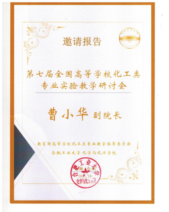 10月23日—25日,第七届全国高等学校化工类专业实验教学研讨会在合肥市召开。会议由教育部高等学校化工类专业教学指导委员会主办,合肥工业大学化学与工程技术学院承办,会议采取线上线下同步进行。全国化工教指委副主任委员刘有智教授、秘书长夏淑倩教授、国家级教学名师钟秦教授等13位教指委委员、认证委员会专家以及来自全国115所高校的近260位实验教学领域的专家和教师参加了本次线下会议,约300位专家教师参加了线上会议。永利yl23411集团官网化学化工学院曹小华教授、周德志老师应邀参会,并做了报告。