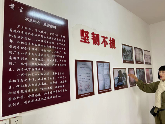 展厅二楼陈列室按照“坚韧不拔”“艰苦创业”“崇尚科学”“开拓奋进”四个主题布展,再现了老一辈“共青人”在金湖乡建立垦殖场,办机耕队、砖瓦厂、板鸭厂的创业历程。在共和国成立不久便成立的共青垦殖场可谓是和国家一同成长。以马克思主义和毛泽东思想为指导,坚持问题导向与科学分析,共青垦殖人就是这样在艰苦的环境中树立起心中的明灯,从而更好地在他们那个艰苦又光辉的时代开拓奋进。