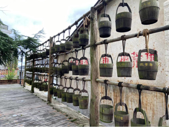 学生代表2020级管理学院陈彦君说:“我非常惭愧,今天才知道著名的‘鸭鸭’羽绒服是从咱们江西共青城成立并走向全国的,不知道竟然有着这样的红色过往。”“吃水不忘挖井人”,一行人来到园内的水井和水桶边。水井虽然早已不再实用,被挂起的98只水桶也生上层层青苔,磨损严重,但是它们作为老一辈“共青人”发挥光热的证明,仍然存续在当代青年的眼前,熠熠生辉。