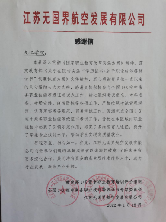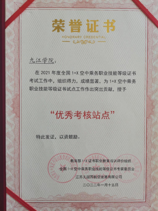 永利yl23411集团官网被评为教育部1+X空中乘务职业技能等级证书2021年优秀考核站点