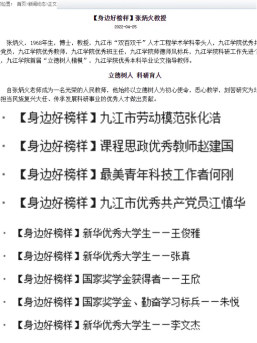 在青春的赛道上奋力奔跑,榜样楷模领风骚。为引导青年大学生向英雄学习、向前辈学习、向榜样学习,争做堪当民族复兴重任的时代新人,药生学院还广泛在院系内开展“身边好榜样”先进事迹征集活动,自2021年7月至今累计已经完成采访了共计10位师生,并通过药生学院网站 “身边好榜样”专栏在师生中广泛宣传。最新一期4月25日刊发的九江市“双百双千”人才工程学术学科带头人、九江学院首届“立德树人楷模”九江学院师德师风标兵——张炳火教授的先进事迹在学院师生中引起热烈反响,一些已经毕业的学生在得知该项活动后,也积极提供了张教授潜心育人的事迹素材。目前,此项“身边好榜样”活动还在持续开展中。
