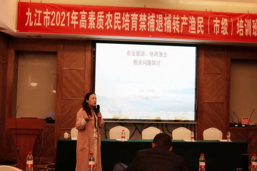 聚焦农民素质提升,精准开展专题业务技术培训。学院围绕“全面落实长江禁捕退捕任务,落实渔民转产就业”,积极联合九江市农业农村局水科所举办了“九江市2021年禁捕退捕转产农民培训班”。学院组织专业教师应邀为培训班开展“挖掘渔村文化,发展特色旅游”系列培训,围绕休闲渔业、乡村民宿、研学旅行、美丽乡村建设、乡村餐饮等内容为参训学员进行专题培训。同时,为提升都昌县干部队伍的专业素养,学院王丽霞老师以《塑造您的职业形象——职场(商务)礼仪》为专题,从职业素养切入,结合商务活动要求、党政工作实际,将商务礼仪融入到具体案例中,通过图片展示、个人示范、观众互动的形式,生动演绎了一堂既具有针对性、又具有实用性的商务礼仪课程。