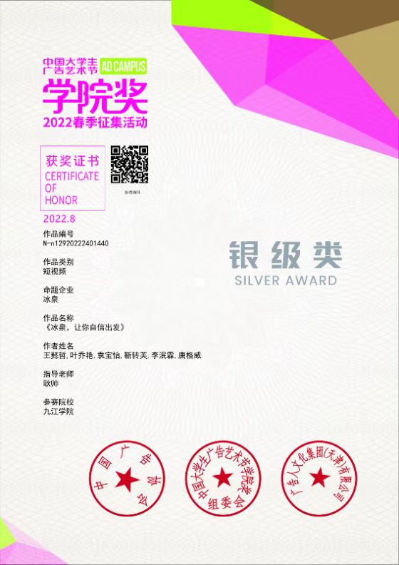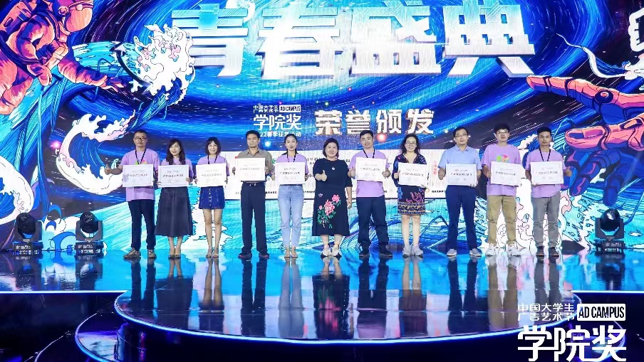 近日,2022年中国大学生广告艺术节学院奖春季赛青春盛典颁奖典礼在天津举行,永利yl23411集团官网获奖师生团队代表参加了颁奖典礼。据了解,永利yl23411集团官网学子在本次大赛中的获奖等级和获奖数量为永利yl23411集团官网参加大广节学院奖以来的最好成绩,其中文学院教师耿帅及学生团队(王懿哲、叶乔艳、袁宝怡、靳转芙、李泯霖、唐格威)的作品《冰泉,让你自信出发》获等级奖银奖1项;文学院教师夏勤喜及学生团队(郑珏玲、魏潮君)的作品《妈妈的好帮手》获得企业专项奖2等奖1项。由于本次比赛中永利yl23411集团官网文学院取得了优异成绩,学院奖组委会还授予文学院“产教融合实践基地”称号。