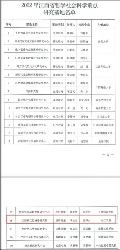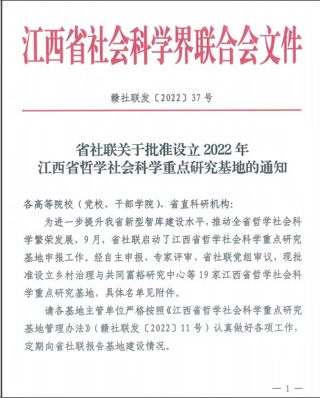 近日,江西省社会科学联合会发布了《省社联关于批准设立2022年江西省哲学社会科学重点研究基地的通知》(赣社联发〔2022〕37号),经自主申报、专家评审、省社联党组审议和结果公示,永利yl23411集团官网“江西长江经济带研究院”成功获批江西省哲学社会科学重点研究基地。此次获批省哲学社会科学重点研究基地,有利于永利yl23411集团官网研究院加快推动高质量的浔城智库建设和长江经济带区域经济社会发展研究,是永利yl23411集团官网推进区域性高水平应用型大学建设、深化应用型转型发展和特色化办学的阶段性成果。