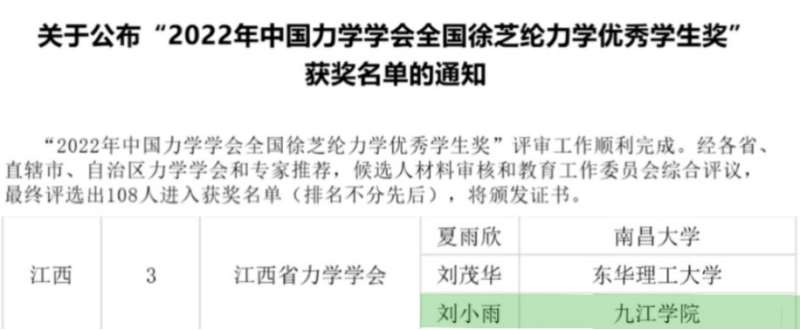 11月29日,中国力学学会官网公布了“2022年中国力学学会全国徐芝纶力学优秀学生奖”获奖名单,经江西省力学学会推荐,建筑工程与规划学院土木工程专业A1911班刘小雨同学获此殊荣,这是该学院学子首次获此殊荣。