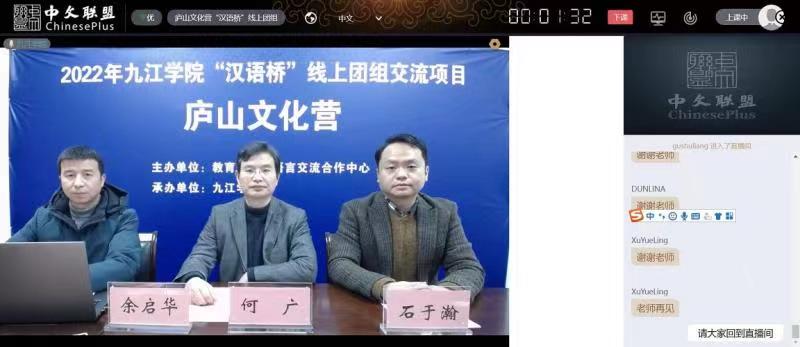 12月16日下午,由教育部中外语言交流合作中心主办,九江学院承办的九江学院2022年“汉语桥”线上交流项目——庐山文化营闭营仪式顺利举行。学校国际合作交流处负责人、柬埔寨皇家科学院孔子学院中方院长以及来自柬埔寨、缅甸和泰国的100多位营员相聚云端,共同见证了此次活动的完美收官。