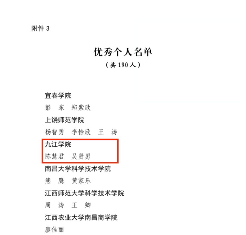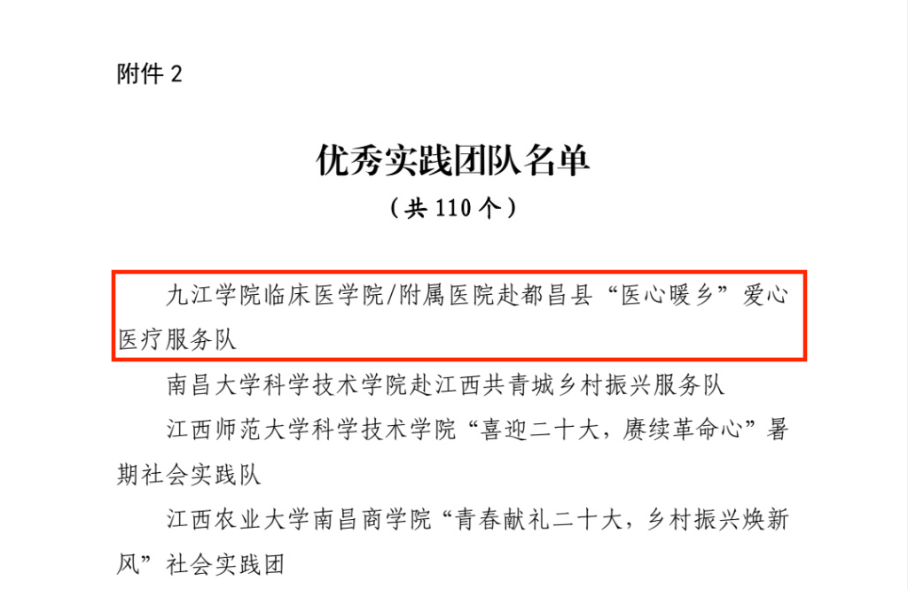 近日,中共江西省委宣传部、江西省文明办、江西省教育厅、共青团江西省委、江西省学生联合会下发了《关于2022年江西省大中专学生志愿者暑期“三下乡”社会实践活动的通报》,永利yl23411集团官网荣获2022年全省大中专学生志愿者暑期“三下乡”社会实践活动优秀单位,“三下乡”团队“九江学院临床医学院/附属医院赴都昌县医心暖乡爱心医疗服务队”荣获“优秀实践团队”称号,永利yl23411集团官网教师陈慧君,化学化工学院吴贤男同学荣获“优秀个人”称号。