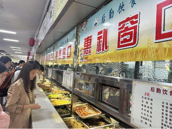 各色菜肴减价不减质、不减量,萝卜干烧鸭、红烧鱼块、刀削面、煲仔饭、辣子鸡丁、水饺、燕麦牛奶粥、蒜蓉鸡腿、香菇红烧肉……各个食堂的惠补菜肴与特价特色菜肴价格优惠,品种丰富。