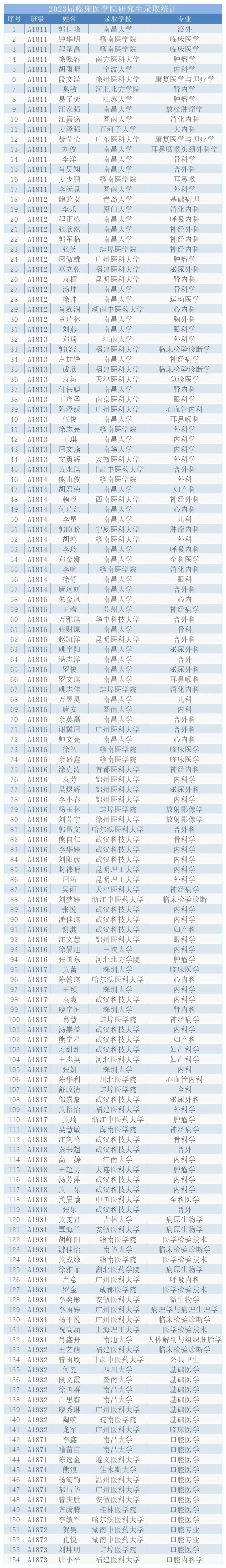 从临床医学院2023届就业工作领导小组获悉,临床医学院2023届毕业生达到国家考研录取线共200余人,目前已有154名同学被成功录取,创历史新高,部分考生还在调剂中。截至目前,全院各专业平均录取率27.6%,临床医学专业录取率33.24%,医学检验技术录取率27.16%,口腔医学录取率11.02%,其中临床医学专业A1816班考研录取率达到50%。