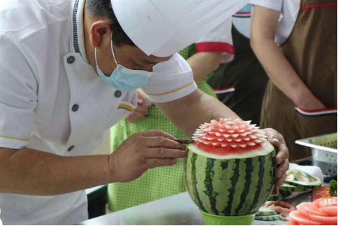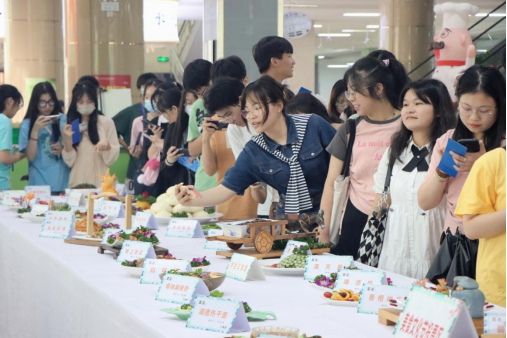 在美食文化节主场学生三食堂一楼大厅内,各食堂的厨师们纷纷拿出自家绝活,一百六十种各色美食精彩呈现,供师生品鉴。从现场制作的精美特色菜到天南地北的地方菜,从中式糕点到西式美食,餐厅的每一个角落都氤氲着烟火的温度。精湛的雕刻技艺和精巧的加工摆盘设计充分体现了美味与创意的融合,让到场的学生直呼过瘾。