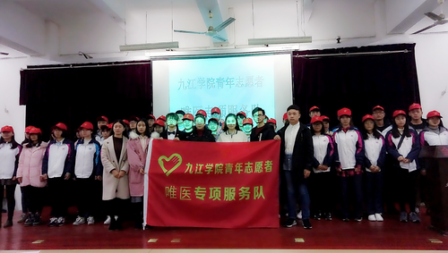 自《健康中国“2030”规划纲要》出台后,为顺利开展校园健康教育及医疗服务工作,建设平安健康校园,校医院和校团委一道组建了学生唯医志愿服务队,并于2018年在文理实验楼正式启动授旗,旨在普及卫生健康安全知识,在校医院指导下开展与卫生健康相关的服务活动。经过几年的时间,培养一批高品德素质、有吃苦耐劳、敬业奉献精神,责任心强,能代表九江学院形象的优秀志愿者,为社会传递互帮互助的正能量,弘扬社会主义核心价值观。