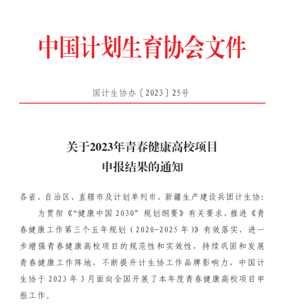 4月28日,中国计划生育协会公布了《关于2023年青春健康高校项目申报结果的通知》。校医院组织申报的“青春健康,伴你前行”项目成功入选2023年度青春健康高校项目。