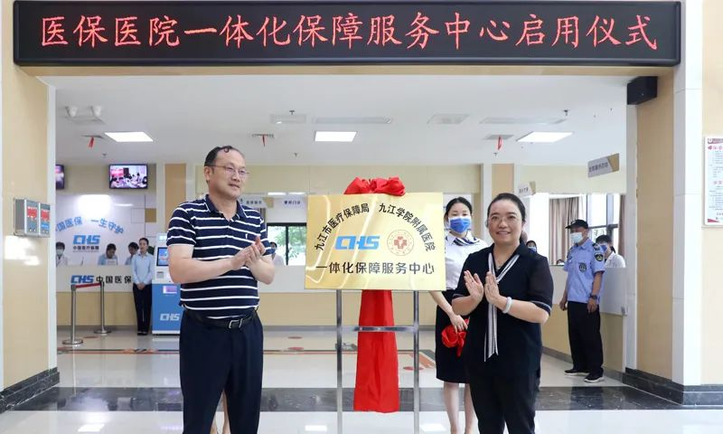 九江市医疗保障局党组书记、局长宋细妹和九江学院附属医院院长殷小平共同为医保医院一体化保障服务中心揭牌。