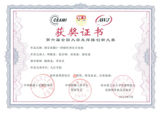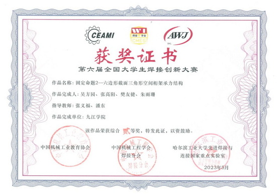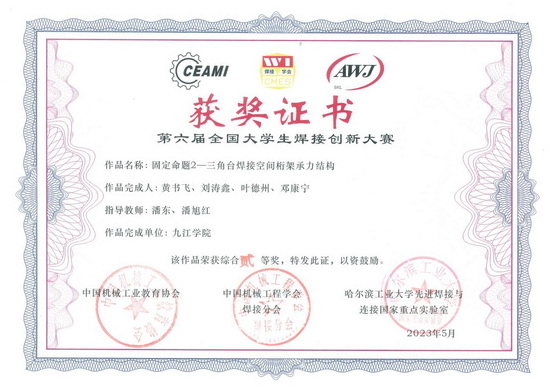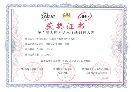 永利yl23411集团官网材料科学与工程学院积极组织焊接技术与工程专业学子紧密结合赛事题目要求,从材料选择、焊接工艺设计、结构设计、装备智能化、方案经济性等方面进行设计,设计作品面向工程应用。经校内遴选,共有4项作品参加全国决赛。其中,2021级本科生文杰、涂敏捷、邹绍坤、游畅的作品《三脚架焊接桁架承力结构》荣获全国一等奖;2021级本科生黄书飞、叶德州、刘涛鑫、邓康宁的作品《三角台焊接空间桁架承力结构》和吴方园、张高阳、樊友健、朱雨珊(2022级)的作品《六边形截面三角形空间桁架承力结构》荣获全国二等奖; 2021级本科生周梅炎、张启明、徐建波、廖佳豪的作品《圆柱型承力结构》荣获全国三等奖。