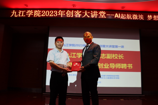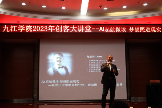 5月31日下午,九江学院2023年创客大讲堂第一讲在学校逸夫图书馆报告厅开讲。国家级重大人才工程入选者、深圳微埃智能科技有限公司创始人/CEO赵紫州受邀为主讲嘉宾,与师生们分享他回国后五年的创业故事。副校长李松志出席活动并为赵紫州颁发聘书。市工信局副局长宋凯及科技科有关负责人和市委人才办负责人张广军应邀参加活动。