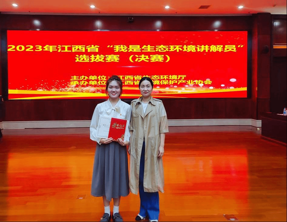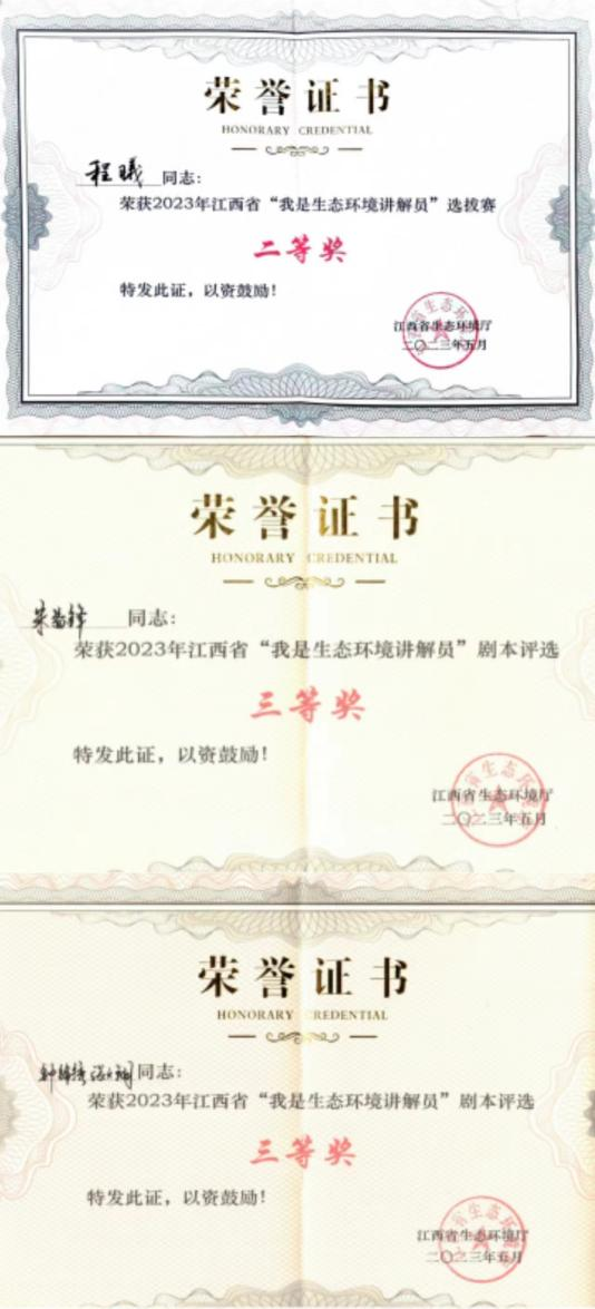 经过顽强拼搏,程曦同学从预选、初赛中脱颖而出,并在决赛中发挥出色,荣获2023年江西省“我是生态环境讲解员”选拔赛二等奖,并将作为参加生态环境部比赛的候补人选参加后期培训;同时,钟锦绣、张天翔、朱益锋同学还荣获“优秀剧本”三等奖2项。