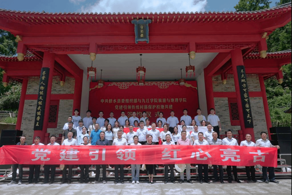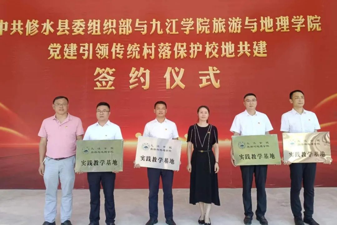 旅游与地理学院与修水县委组织部签订了党建引领传统村落保护校地共建协议。修水县领导刘雪萍、黎青、苏仁泽向九江学院旅游与地理学院博士专家团队成员雷彬、陈海龙、朱民、崔明月、魏伟新颁发修水县党建引领传统村落保护智库专家聘书;旅游与地理学院领导夏英、吴彭年为修水县黄坳乡、黄沙镇、布甲乡、新湾乡实践基地授牌。仪式结束后,与会人员参观了博士工作站和朱砂古村。