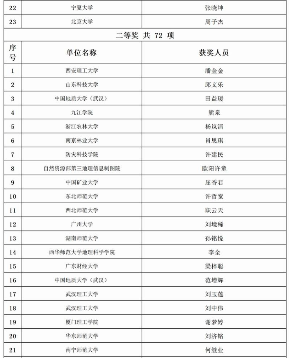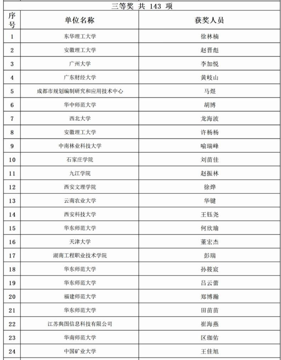第三届地理信息技术与应用技能大赛是由中国信息协会主办,易智瑞信息技术有限公司、中科地信(北京)遥感信息技术研究院联合承办的具有较高水平的地理信息技术应用行业的比赛。此次大赛共有北京大学、武汉大学、中国地质大学(北京)、中国人民大学、华东师范大学、同济大学等在内的近170所高校地理信息科学、测绘工程、城乡规划、生态环境、信息工程、遥感科学与技术等相关专业近800位选手参加。中国信息协会专家咨询委员会委员、国家审计署信息中心原主任周德铭,自然资源部信息中心副主任李晓波,中国信息协会副会长李红,北京大学教授赖茂生等专家担任此次竞赛评委。在几番激烈角逐后,最终评选出一等奖27名(团体4名,个人23名),二等奖83名(团体11名,个人72名),三等奖164名(团体21名,个人143名)。