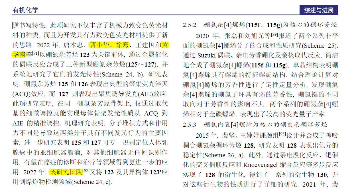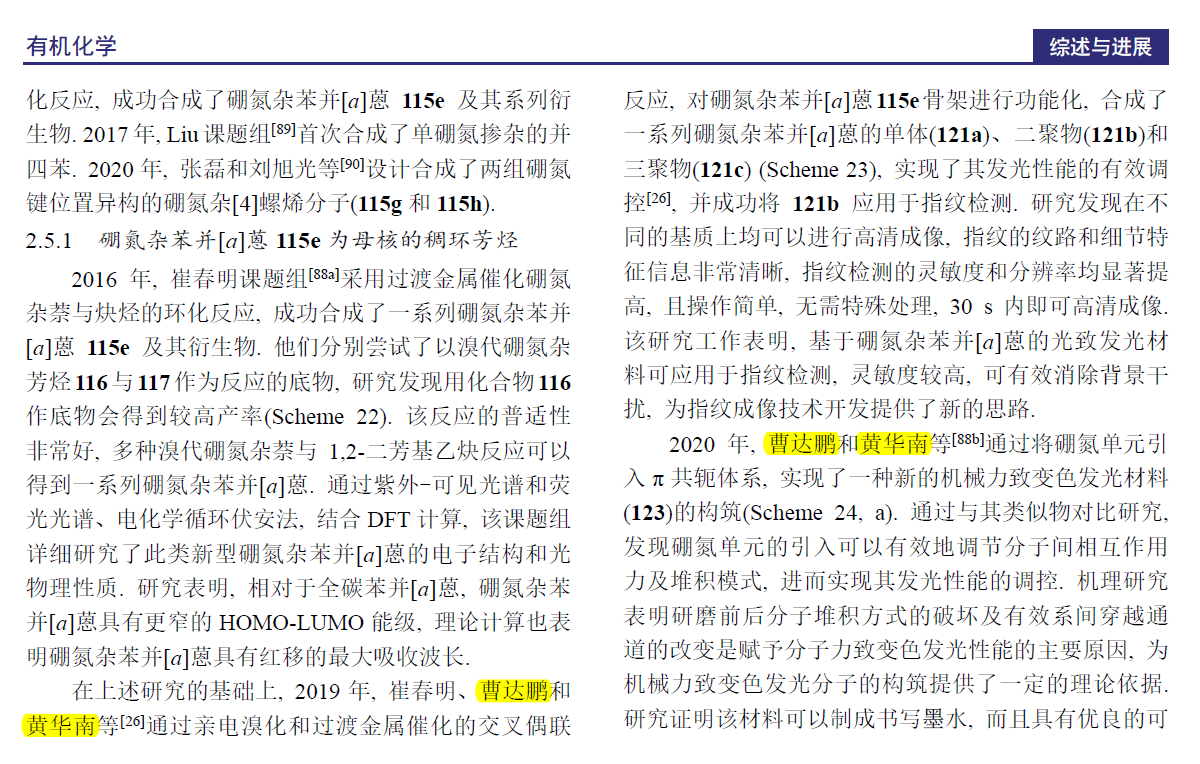 化学化工学院有机智能材料创新团队自成立以来一直致力于含主族元素有机功能分子的构筑及应用研究。团队以利用最简单、最实用的方法构筑一些结构独特、性能优异的有机功能分子为宗旨,在拓展硼氮有机功能材料的种类和功能方面已取得了部分创新性研究成果。特别是通过将现代合成方法学与硼氮有机功能分子的构筑巧妙结合,构筑了一系性能出色的硼氮功能分子,解决了硼氮功能分子构筑方法单一,新性能开发难的难题。目前已实现智能材料在指纹识别、信息防伪、人体乳腺癌细胞器高清成像、炸药可视化检测、人体谷胱甘肽检测等方面的应用。相关研究成果已在Angew. Chem. Int. Ed,Chem. Sci,Anal. Chem,Chem. Eng.J,J. Mater. Chem. A,Org. Chem. Front,Adv. Optical Mater,Dyes and Pigments等化学领域国际顶级及权威期刊发表。这些研究结果拓展了硼氮功能分子的研究边界,为认识硼氮功能分子新的性质和功能提供了新视角。