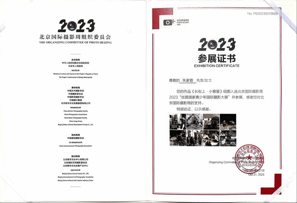 永利yl23411集团官网艺术学院产品设计专业A2041班朱家蓉同学摄影组照作品《长街上,小巷里》和单张作品《对弈》成功入选北京国际摄影周暨丝路国家青少年摄影大展,朱家蓉同学还获邀出席本届活动开幕式。