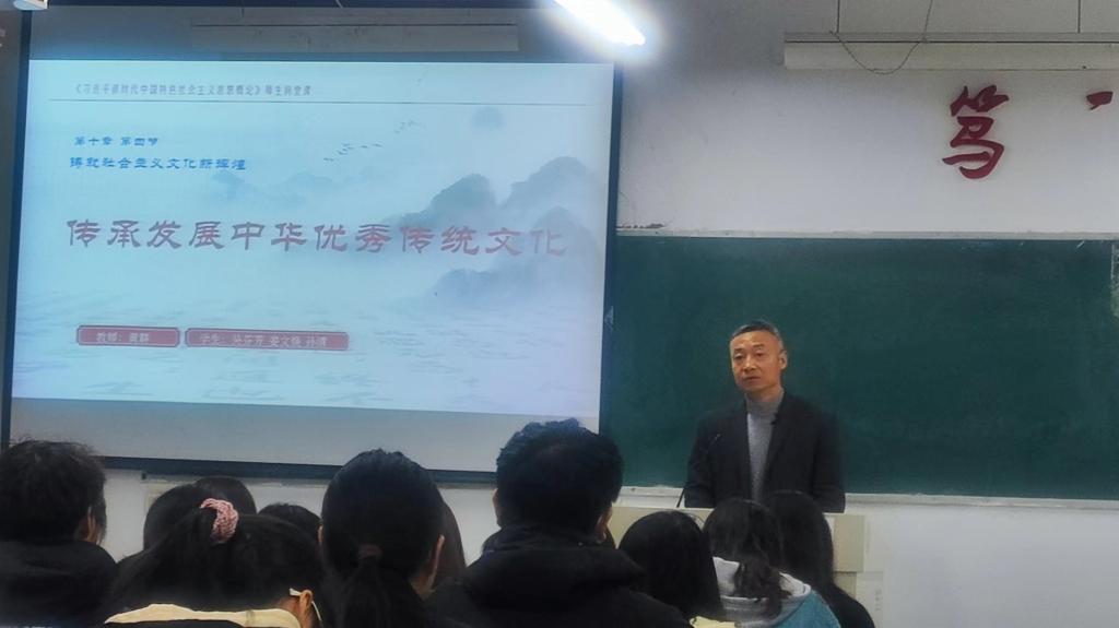 黄群老师和吴芬芳、姜文焕、孙清三位同学与大家共同探讨《习近平新时代中国特色社会主义思想概论》课第十章第四节的内容《如何传承发展中华优秀传统文化》。三名同学分别从深刻把握中华文明的突出特性,推动中华优秀传统文化创造性转化、创新性发展,保护好传承好文化遗产三个方面讲解如何传承发展中华优秀传统文化,并结合身边如何传承传统文化的事例,激发了同学们的自豪感、认同感和参与感。在每名同学讲解后,黄群老师都给予点评和补充,最后再进行课堂小结,使学生对中华优秀传统文化有了更加全面的了解。