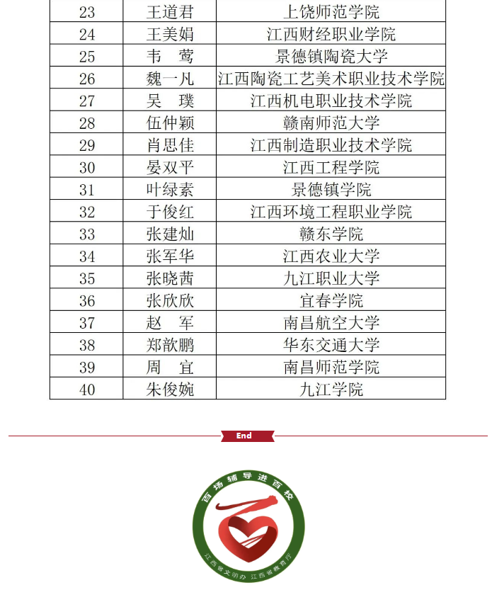 据了解,按统一选拔标准,全省共458位老师报名申请参加第四届“百场辅导进百校”活动,经过活动组委会办公室审核教师资质,共选拔出40名业务能力强、教学效果好、热心公益的心理健康教育教师。选拔时,兼顾了不同类型的学校,侧重于高校及覆盖地区的广度。入选江西省第四届青少年心理健康教育辅导队的心理健康教师,将由省文明办、省教育厅统一颁发聘书。