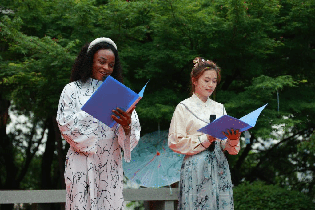 琴音袅袅,诗吟悠悠。诗会中,同学们吟诵了学生获奖作品《见春天》《望》《物语》《点绛唇∙阳春曲》,或浅唱低吟,或抑扬顿挫。中外学生齐诵作品《你是人间的四月天》,展现了跨文化交流的浪漫表达。