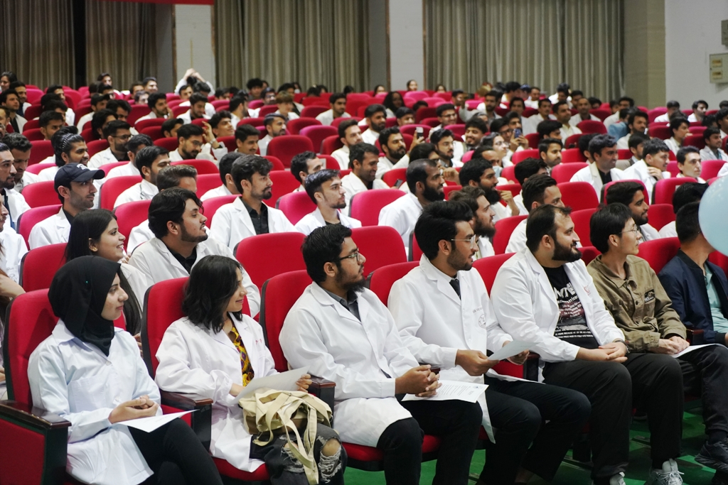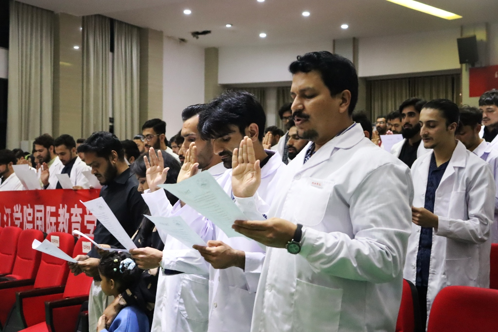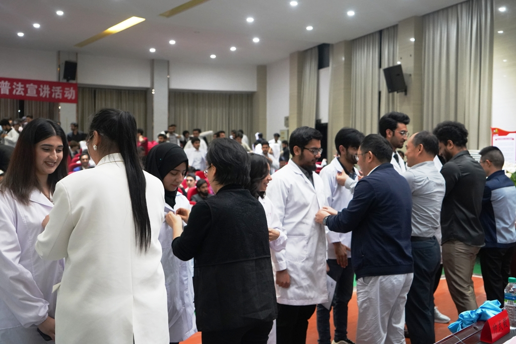 宣誓仪式上,医学留学生齐声庄严宣誓,许下对生命的敬畏、对医学事业的崇敬之情,立志为人类卫生健康共同体建设贡献青春力量。基础医学院、口腔医学院及国际教育学院等负责人为学生代表穿上白大褂。