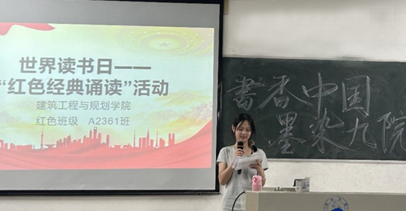 世界读书日当天,学院大一风景园林专业A2361班的同学们在望庐楼开展了“书香中国,墨染九院——红色经典诵读”主题活动。同学们以饱满的热情朗诵了《红船的方向》《赵一曼家书》《中华颂》等一系列经典作品。慷慨激昂的诵读声带领大家走进那段波澜壮阔的革命历史,感受革命先烈的英勇无畏。