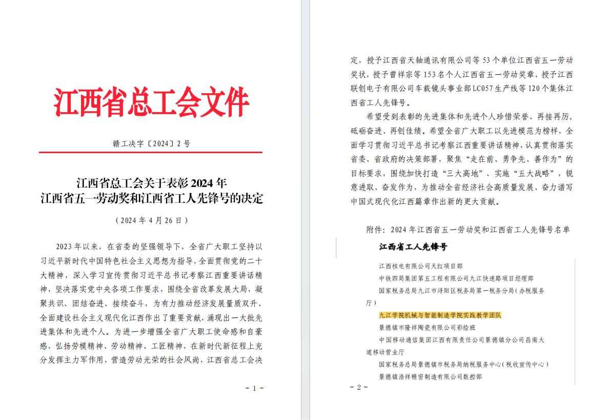 4月26日,2024年江西省庆祝“五一”国际劳动节暨全省五一劳动奖和工人先锋号表彰大会在南昌召开,2024年江西省五一劳动奖和江西省工人先锋号名单同步揭晓,全省共评出120个“江西省工人先锋号”集体,由校工会推荐的机械与智能制造学院实践教学团队荣获“江西省工人先锋号”殊荣。