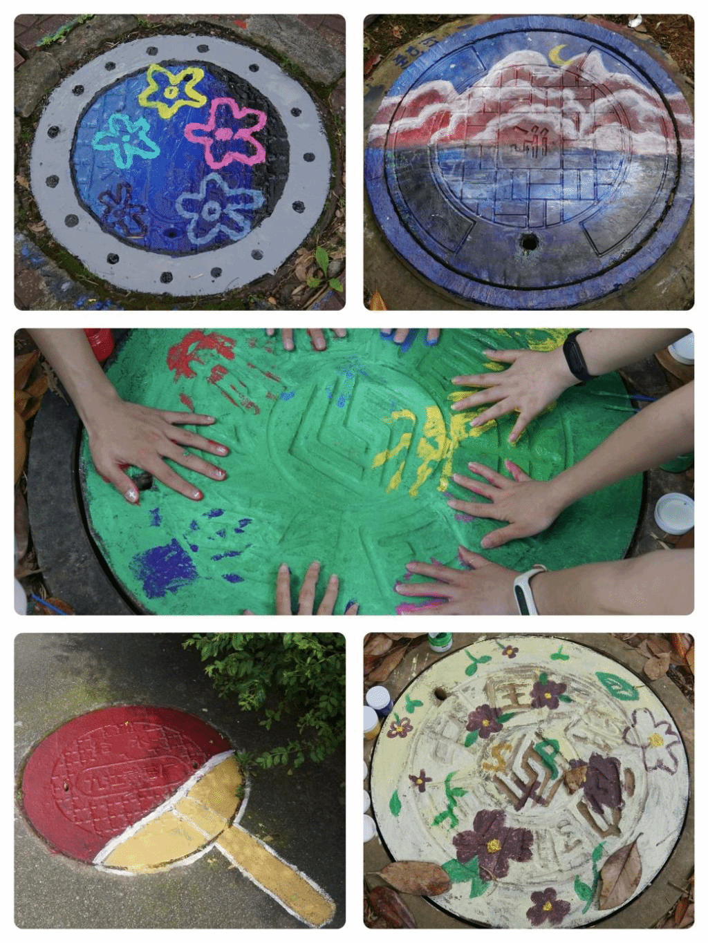 “好可爱!是海绵宝宝!”“一起保护地球!”“今天是母亲节,这幅画送给妈妈!”……5月12日下午,九院校园出现一群“小画家”,林荫里,烈日下,他们拿着颜料和工具,在校园的各个井盖上作画,一个个创意满满的井盖吸引了九院学子驻足观赏、拍照打卡,纷纷为这“脚下的风景”点赞,成为春日的校园里一道亮丽的风景线。