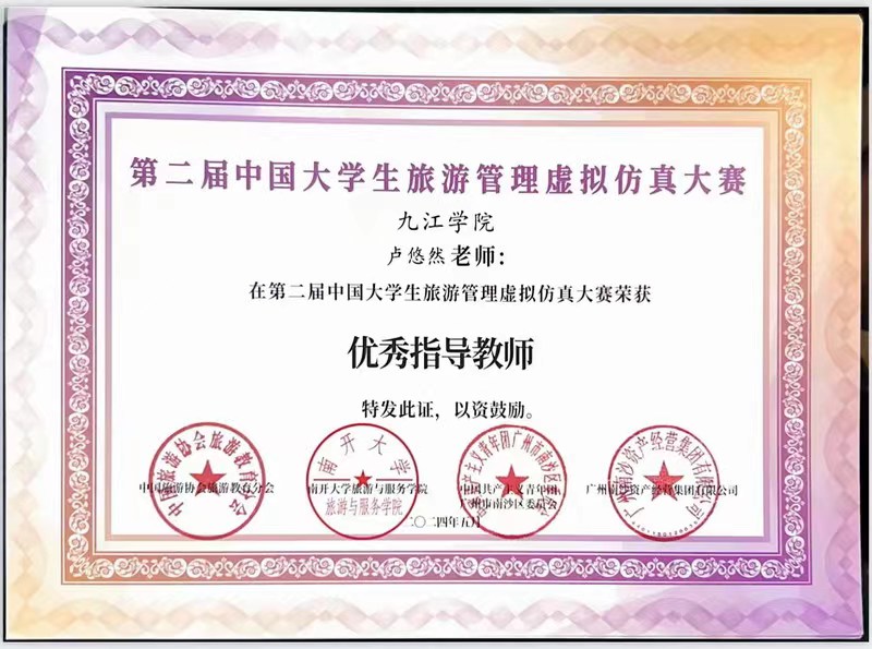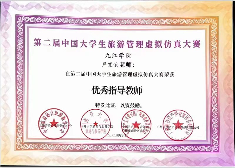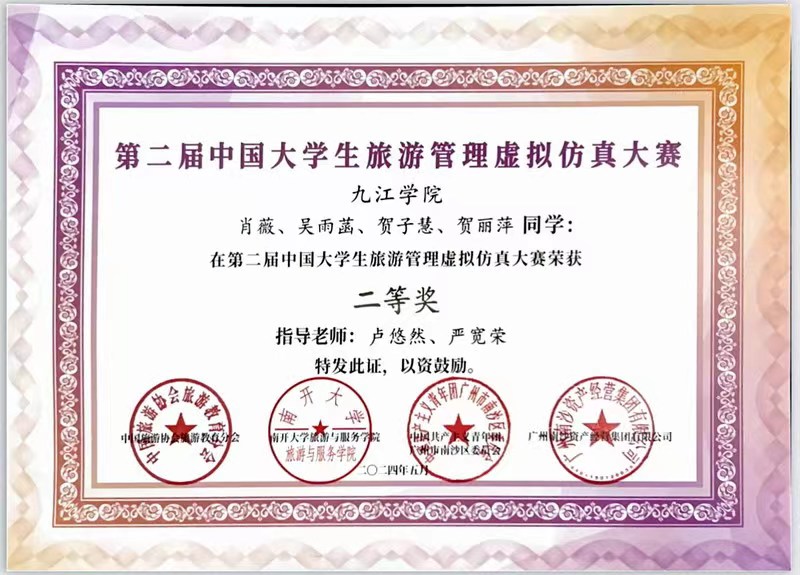 5月19日,由中国旅游协会旅游教育分会、南开大学旅游与服务学院联合主办的第二届中国大学生旅游管理虚拟仿真大赛决赛在广州南沙落下帷幕。旅游与地理学院酒店管理专业A2252班肖薇、吴雨菡、贺子慧、A2151班贺丽萍组队参加了全国总决赛,经过激烈比拼,荣获全国二等奖,指导老师卢悠然和严宽荣老师荣获“优秀指导教师”称号。该院学生文旅项目策划方案评分在决赛224支代表队中排名第一。